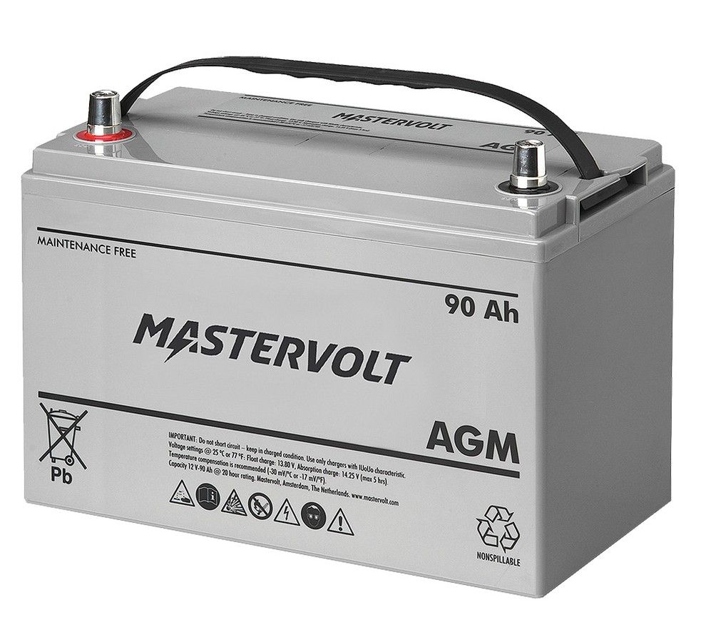 Аккумуляторная батарея Mastervolt AGM, 12 В, 90 АЧ (10267577). Стартерно-тяговые аккумуляторные батареи AGM-типа (с поглощенным электролитом). Универсальные - отдают высокие стартерные токи, но в то же время могут более длительное время питать нагрузку без потери емкости в условиях эпизодической подзарядки, чем обычные батареи с жидким электролитом. Электролит в этих аккумуляторных батареях поглощен пластинами из стекловолокна, что обеспечивает аккумуляторам абсолютную герметичность и позволяет работать при значительных кренах. Батареи необслуживаемые и не выделяют взрывоопасный газ в процессе зарядки (при условии использования соответствующего автоматического зарядного устройства с правильно выбранным режимом заряда). Более толстые свинцовые пластины, изготовленные без использования вторично переработанного свинца, обеспечивают этим аккумуляторам более долгий срок службы и минимальную потерю емкости в процессе эксплуатации. Стандартные контакты А-типа могут быть откручены, а имеющиеся под ними резьбовые шпильки М8 (М6 на аккумуляторе 55 АЧ) использованы для объединения нескольких батарей в группу.