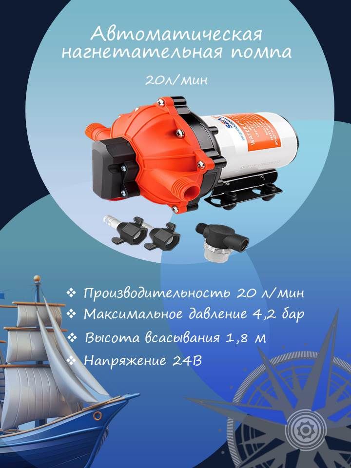 Автоматическая нагнетательная помпа (5-камерная) TTI, 20 л/мин, 24 В (10265661). Самовсасывающая диафрагменная электрическая помпа для подачи воды с автоматическим выключателем. Применяется для поддержания давления в бортовой водопроводной системе. Не повреждается при "сухой" работе. Рабочий элемент - 5 диафрагм. Благодаря создаваемому высокому давлению, может быть использована как помпа для мытья палубы. Штуцеры с водопроводной резьбой ½ дюйма.