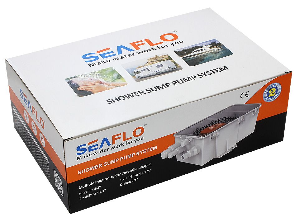 Бак сточный для душа, 12 В (10264014). Промежуточный пластиковый бак для слива воды из раковины, душа и т.д. Применяется в случаях, когда из-за недостатка места невозможно достаточно низко разместить сточный бак необходимого объема. Стекающая вода попадает в бак по нескольким шлангам (бак имеет 3 впускных штуцера разного диаметра), а затем с помощью установленной в баке трюмной помпы с поплавковым выключателем удаляется в накопительный сточный бак достаточного объема, высота установки которого при такой схеме уже не имеет особого значения. Снабжен легко очищаемым фильтром и прозрачной крышкой. Бак поставляется в комплекте с автоматической (встроенный поплавковый выключатель) помпой производительностью 48 литров в минуту*.