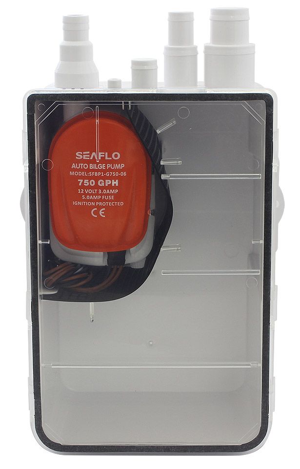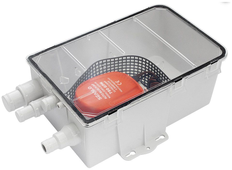 Бак сточный для душа, 24 В (10264270). Промежуточный пластиковый бак для слива воды из раковины, душа и т.д. Применяется в случаях, когда из-за недостатка места невозможно достаточно низко разместить сточный бак необходимого объема. Стекающая вода попадает в бак по нескольким шлангам (бак имеет 3 впускных штуцера разного диаметра), а затем с помощью установленной в баке трюмной помпы с поплавковым выключателем удаляется в накопительный сточный бак достаточного объема, высота установки которого при такой схеме уже не имеет особого значения. Снабжен легко очищаемым фильтром и прозрачной крышкой. Бак поставляется в комплекте с автоматической (встроенный поплавковый выключатель) помпой производительностью 48 литров в минуту*.