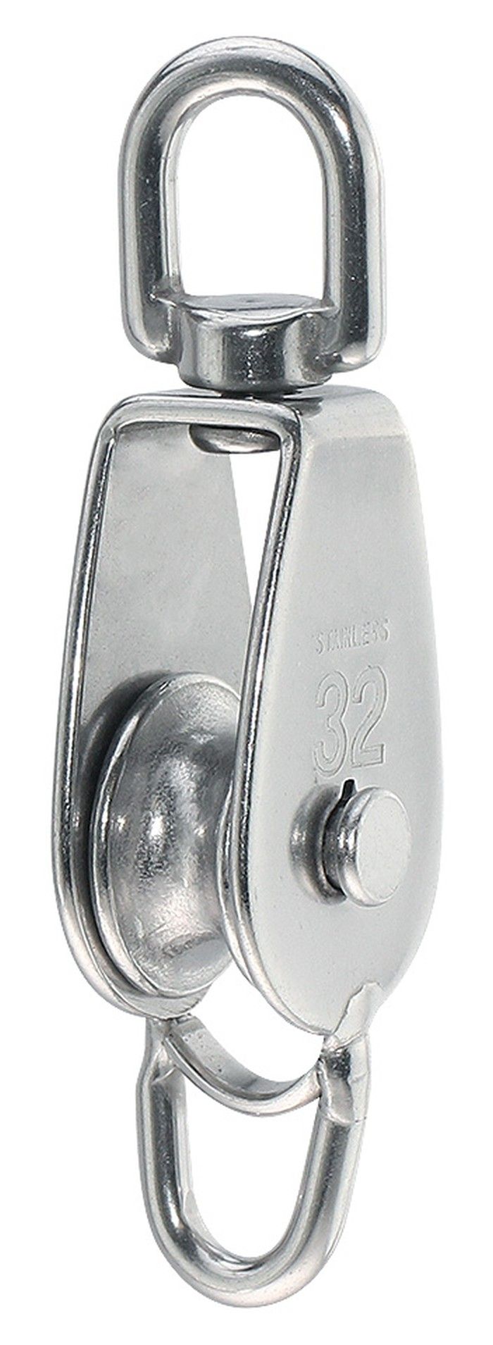 Блок одношкивный с вертлюгом и скобой, 32 мм (10258943). Блоки из нержавеющей стали, одно- и двушкивные со шкивами 25, 32 или 50 мм.