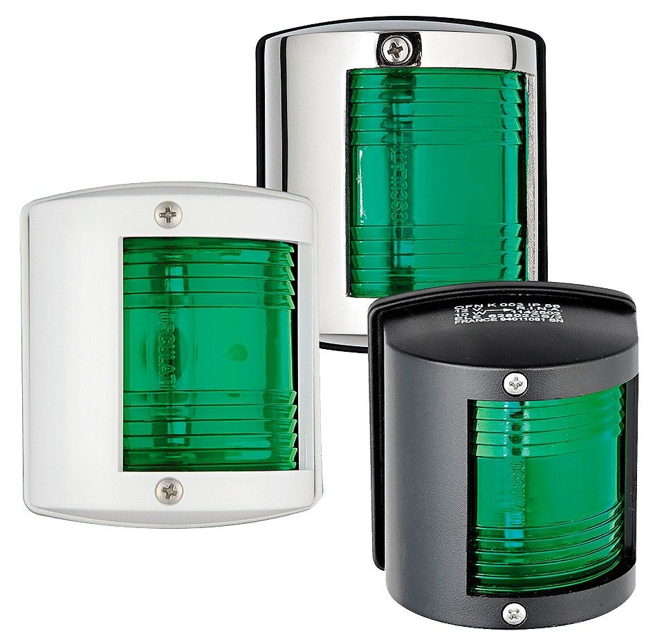 Бортовой огонь "Utility 77", зеленый, пластик. (10014582). Зеленый бортовой отличительный огонь с лампой накаливания. Устанавливается на правом борту судна. Обеспечивает освещение сектора с углом в основании 112,5 градусов. Линза Френеля способствует распределению светового потока в горизонтальной плоскости, что увеличивает дальность видимости огня при неизменной мощности лампы. Рекомендуется для судов длиной до 12 м. Напряжение питания: 12 В. Номинальная мощность: 10 Вт. Материал корпуса: пластик или нержавеющая сталь. Цвет корпуса: черный или серебристый. Размеры: 70х60х60 мм. Страна-производитель: Италия.