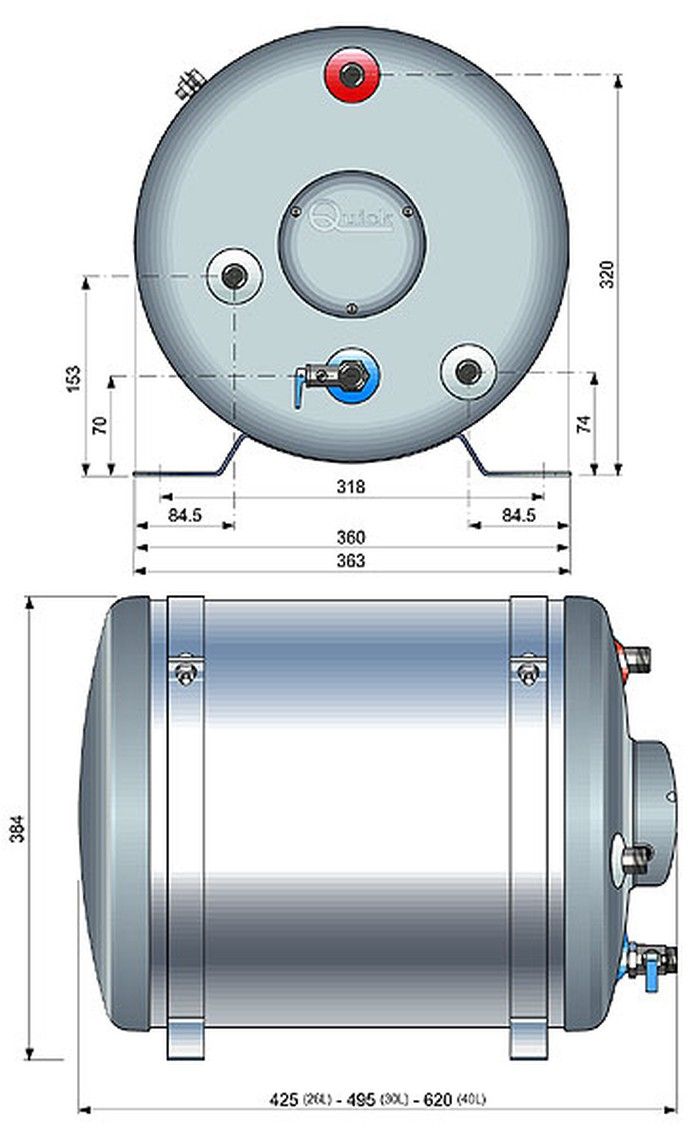 Бойлер, 40 л, 1200ВТ, круглый, с теплообменником. (10236324). Судовой бойлер. Позволяет нагревать воду с помощью ТЭНа (мощностью 500 либо 1200 Вт) от электросети напряжением 220 В, либо от системы охлаждения двигателя (горячий антифриз поступает в теплообменник, 3-метровую нержавеющую спираль, где отдает тепло нагреваемой воде). Поставляется в различных вариантах: с двойным нагревом (с теплообменником - от двигателя и ТЭНом - от сети 220 В), только с теплообменником, либо только с ТЭНом. Бак для воды и внешний корпус изготовлены из нержавеющей стали. Теплоизоляция выполнена из полиуретановой пены. В стандартную комплектацию входит предохранительный невозвратный клапан, обеспечивающий постоянное наполнение бойлера водой и защиту от избыточного давления (он же позволяет спустить воду перед зимним хранением). Максимальная температура нагрева от сети 220 В регулируется с помощью термостата в пределах 40-80 градусов Цельсия (заводская настройка – 60 градусов). Максимальная температура нагрева от системы охлаждения двигателя зависит от интенсивности работы двигателя и настроек термостата его штатной системы охлаждения.