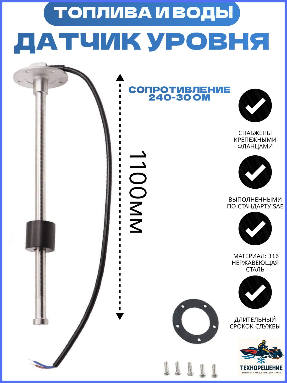 Полностью герметичные датчики из нержавеющей стали. Применяются для измерения уровня топлива или чистой воды (для измерения уровня сточных вод приобретайте другие датчики). Точность измерения уровня −10-40 мм (в зависимости от длины датчика). Снабжены крепежными фланцами, выполненными по стандарту SAE (5 крепежных отверстий - см. рис.).Диапазон измерений: 200-1500 мм. Диапазон сопротивления: 10-190, 240-30 Ом. Страна-производитель: Китай. Пожалуйста, выберите правильную длину датчика уровня топлива / воды, если ваш бак пластиковый, рекомендуется выбрать длину, которая на 1 дюйм меньше, чем глубина бака; Если резервуар металлический, рекомендуется выбирать бак, который на 0,5 дюйма меньше, чем глубина резервуара. Функции: Он подходит для автофургонов, кораблей, яхт, автомобилей, генераторов / генераторных установок, химической промышленности и других областей Он широко используется для измерения уровня в резервуарах для топлива, воды, автомобилей и химических жидкостей Продукт имеет простую конструкцию и точное измерение, а также подходит для различных сред Длительный срок службы, хорошие антисейсмические и антикоррозионные характеристики и т. Д Принцип электромагнитной индукции, выходной сигнал стабилен и непрерывен Только поплавок является движущейся частью, которая износостойка и имеет длительный срок службы Простота установки и подключения