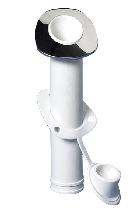 Стакан с фланцем, врезаемый. Снабжен эластичной пробкой для защиты от попадания воды. Корпус из пластика с накладкой из полированной нержавеющей стали на верхнем фланце.