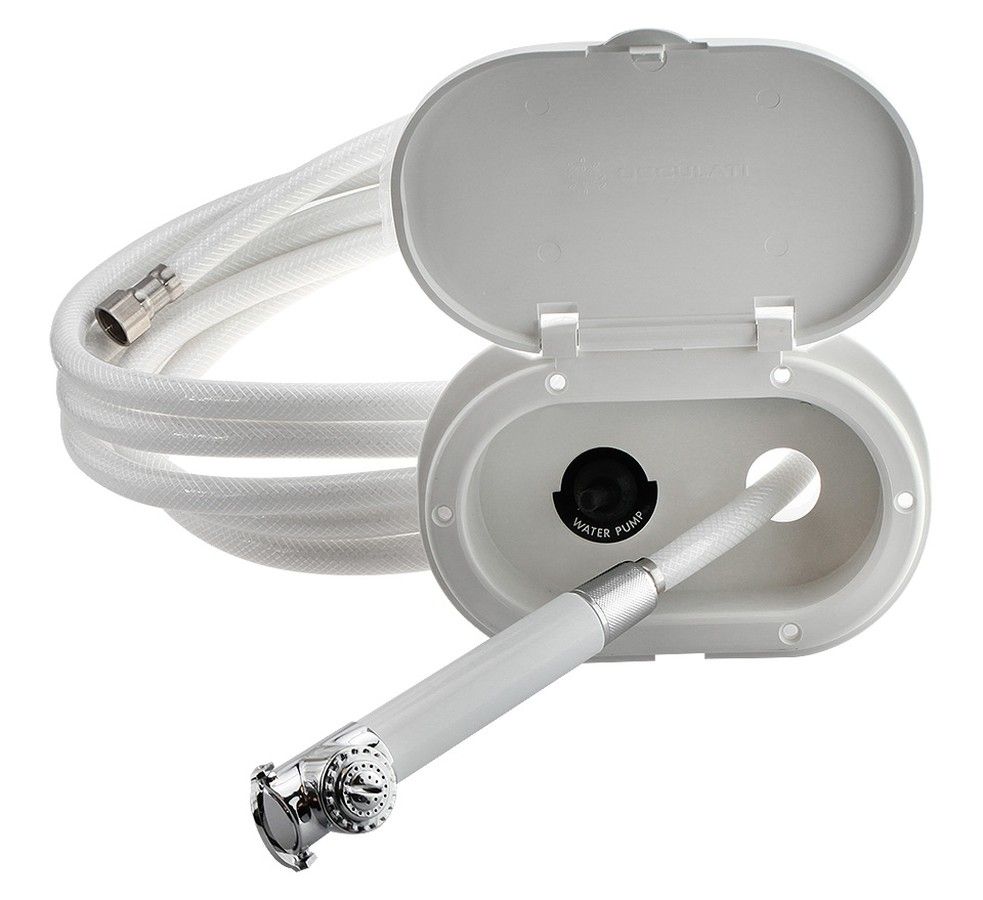 Душ в коробе с выключателем, 4 м (10242120). Душевой короб с защищенным от влаги тумблером, шлангом длиной 2,5 или 4 метра и душевой лейкой с дозирующим клапаном. В нерабочем состоянии закрывается крышкой с защелкой. Используется при отсутствии в системе автоматической нагнетательной помпы. Подача воды включается вручную с помощью тумблера.Размеры врезаемой части: 150x80x40 мм;Размеры наружного фланца с крышкой: 185x124 мм.Производитель: "Osculati", Италияbr