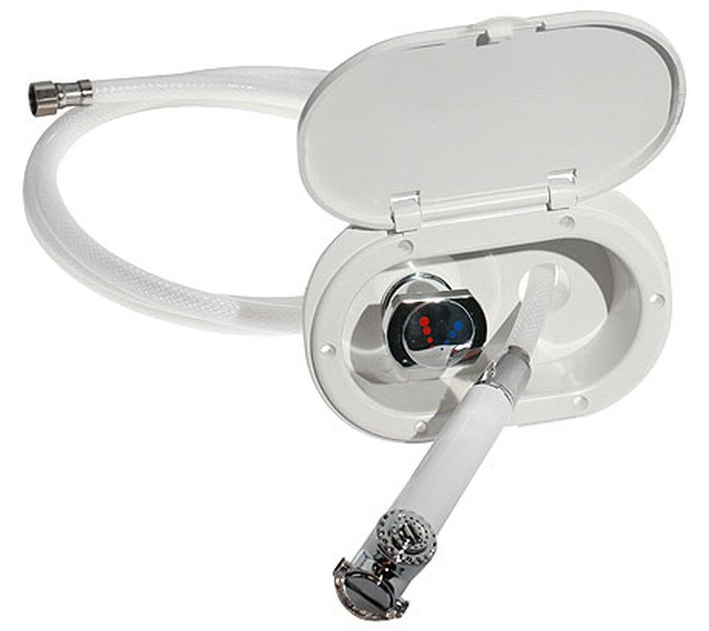 Душевой короб со смесителем, шланг 4 м (10086155). Душевой короб со смесителем для холодной/горячей воды, шлангом длиной 2,5/4 метра и душевой лейкой с дозирующим клапаном. В нерабочем состоянии закрывается крышкой с защелкой. Используется при наличии в системе автоматической нагнетательной помпы.