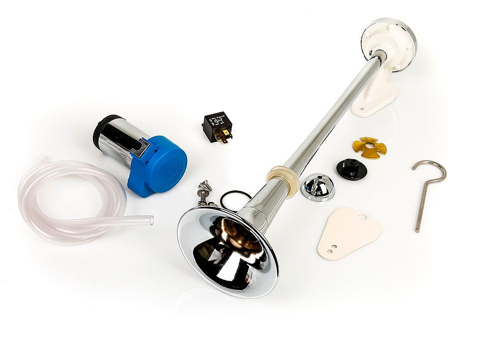 Электропневматический горн, 228 Гц, 12 В (10014867). Электропневматический горн. В комплекте: хромированный медный рожок, воздушный компрессор, шланг, пусковое реле, установочные детали.