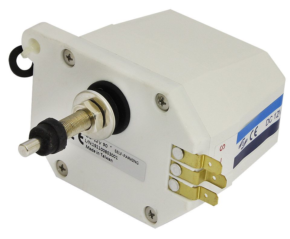 Электропривод стеклоочистителя, "ТМС-804", 110 градусов (10017239). Компактные приводы стеклоочистителя в защищенных от брызг белых пластиковых корпусах. Снабжены функцией автоматического возврата щетки в исходное положение (как в автомобиле - при выключении стеклоочистителя щетка не "зависает" посреди стекла).Длина оси (резьбовая часть и общая): 28/54 мм.