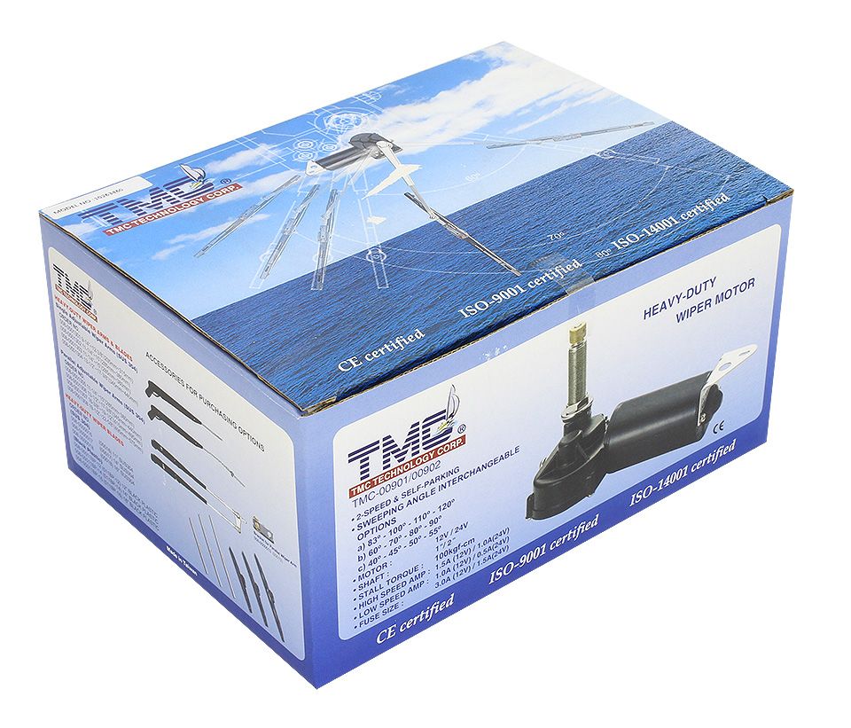 Электропривод стеклоочистителя ТМС-902, 24 В (10263460). Привод стеклоочистителя с мощным двухскоростным мотором и удлиненной осью для особо сложных условий эксплуатации. Может комплектоваться вторым валом и двумя поводками пантографного типа, обеспечивающими плотное прилегание щетки к стеклу в условиях сильного ливня, ветра и захлестывания. Снабжен функцией автоматического возврата щетки в исходное положение (как в автомобиле - при выключении стеклоочистителя щетка не "зависает" посреди стекла). Угол отклонения щетки (изменяется ступенчато): 83-100-110-120 градусов. Длина оси: 85 мм. Напряжение питания: 12, 24 В. Производитель: "TMC", Тайвань.