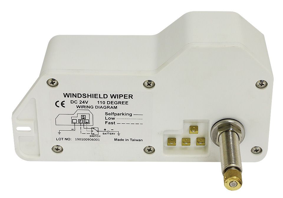 Электропривод стеклоочистителя "ТМС-906" с удлиненным валом, 12 В . Привод стеклоочистителя с мотором увеличенной мощности, удлиненным валом и декоративным пластиковым кожухом. Снабжен функцией автоматического возврата щетки в исходное положение (как в автомобиле - при выключении стеклоочистителя щетка не "зависает" посреди стекла). Угол размаха щетки регулируется. Удлиненный вал позволяет устанавливать привод на толстые стенки рубки или использовать его в комплекте с фальшвалом и поводком пантографного типа.Угол отклонения щетки (изменяется ступенчато): 83-100-110-120 градусов. Длина оси (резьбовая часть и общая): 50/85 мм. Напряжение питания: 12, 24 В. Производитель: "TMC", Тайвань.