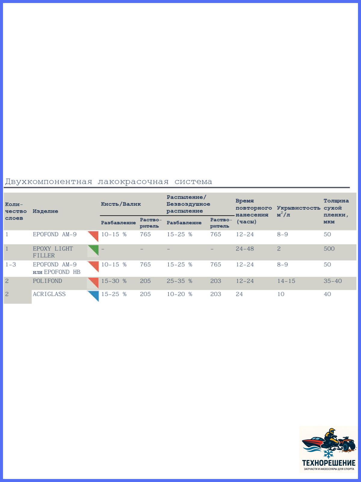 Стеклопластик: поверхность должна быть обезжирена и обработана наждачной бумагой зернистостью 180-220. Нанесите слой грунта Epofond AM-9, разведенного на 15-20% растворителем 765. Дополнительные слои грунта могут быть нанесены в целях противоосмотической защиты, в том числе в комбинации с грунтом EPOFOND HB для более быстрого набора необходимой толщины защитного покрытия (смотри руководство по нанесению противоосмотической защиты).