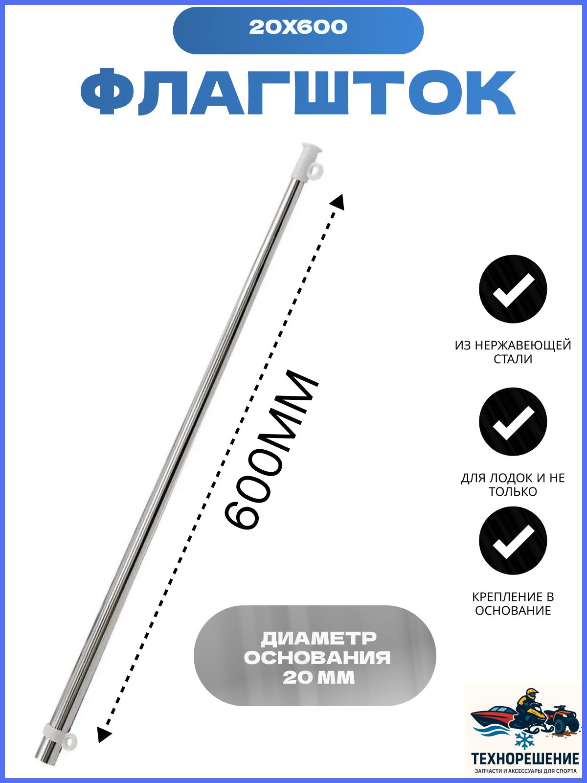 Флагшток, 20х600 мм (10246752). Флагштоки из нержавеющей стали. Основание в комплект не входит и приобретается отдельно.