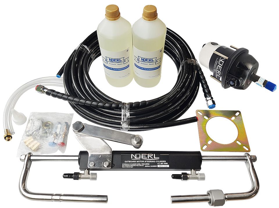 Гидравлическая рулевая система для подвесных двигателей мощностью до 90 л.с. (10268571). Гидравлическая рулевая система. Аналог BayStar от SeaStarSolutions. Предназначена для управления подвесными двигателями мощностью до 90 л.с. Снабжена встроенными NFB клапанами, устраняющими передачу реактивных моментов от двигателя на рулевое колесо, что облегчает управление и повышает безопасность, дает возможность убрать руки с рулевого колеса, не опасаясь неконтролируемого поворота лодки. Примерное количество оборотов полной перекладки руля: 4,5Минимальный радиус изгиба шлангов: 10 см.В составе: рулевая машинка, гидроцилиндр, комплект фитингов, комплект крепежа, гидравлическое масло, комплект шлангов (7 метров).Совместимость с двигателямиМарка
