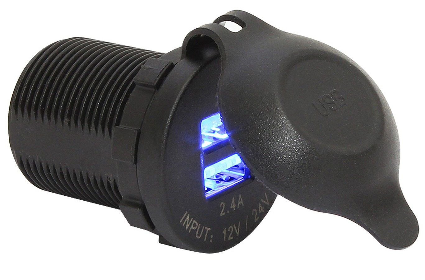 Светодиодная подсветка. Напряжение питания: 12/24 В (бортовая сеть). Максимальный зарядный ток (суммарно на оба гнезда) - 4,8А.