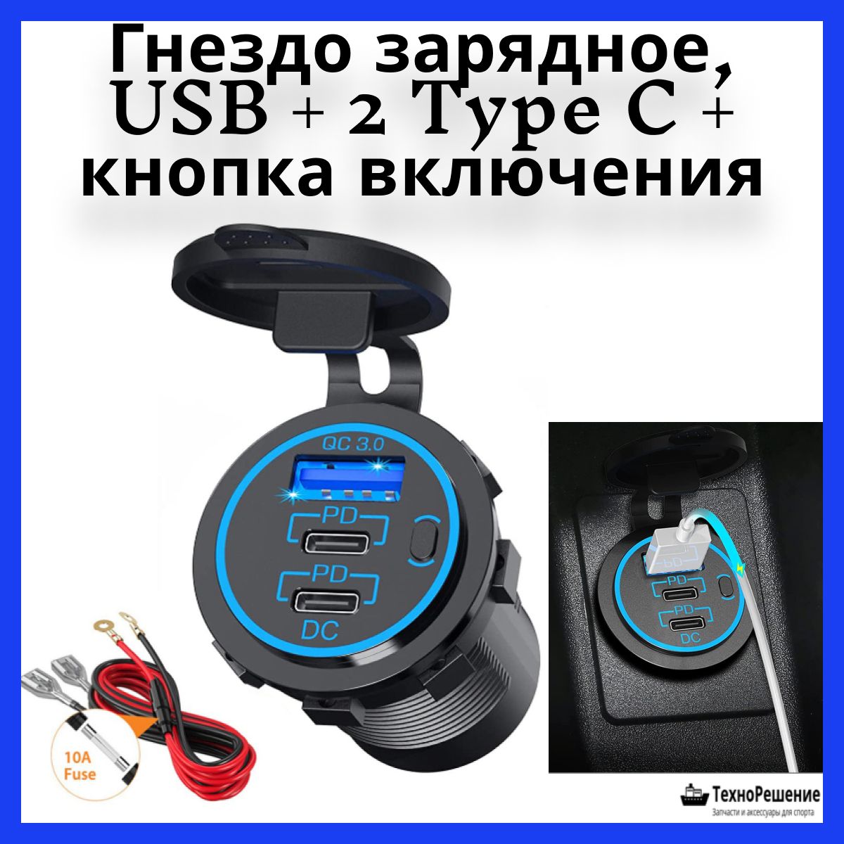Гнездо зарядное, USB + 2 Type C + кнопка включения (10269778). Зарядное гнездо. Один порт USB, два порта Type C, кнопка вкл/выкл.Страна-производитель: Китай.
