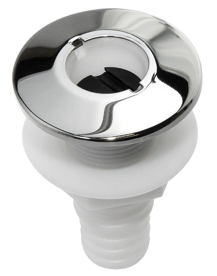 Горловина с патрубком под шланг 3/4''-1'', с клапаном (10264172). Горловина с резьбовым креплением (крепежная гайка в комплекте) и штуцером под шланг диаметром 19-25 мм. Наружный фланец диаметром 49 мм имеет декоративную накладку из нержавеющей стали. Предлагается в двух вариантах - стандартном и с лепестковым клапаном, препятствующим обратному проникновению воды.