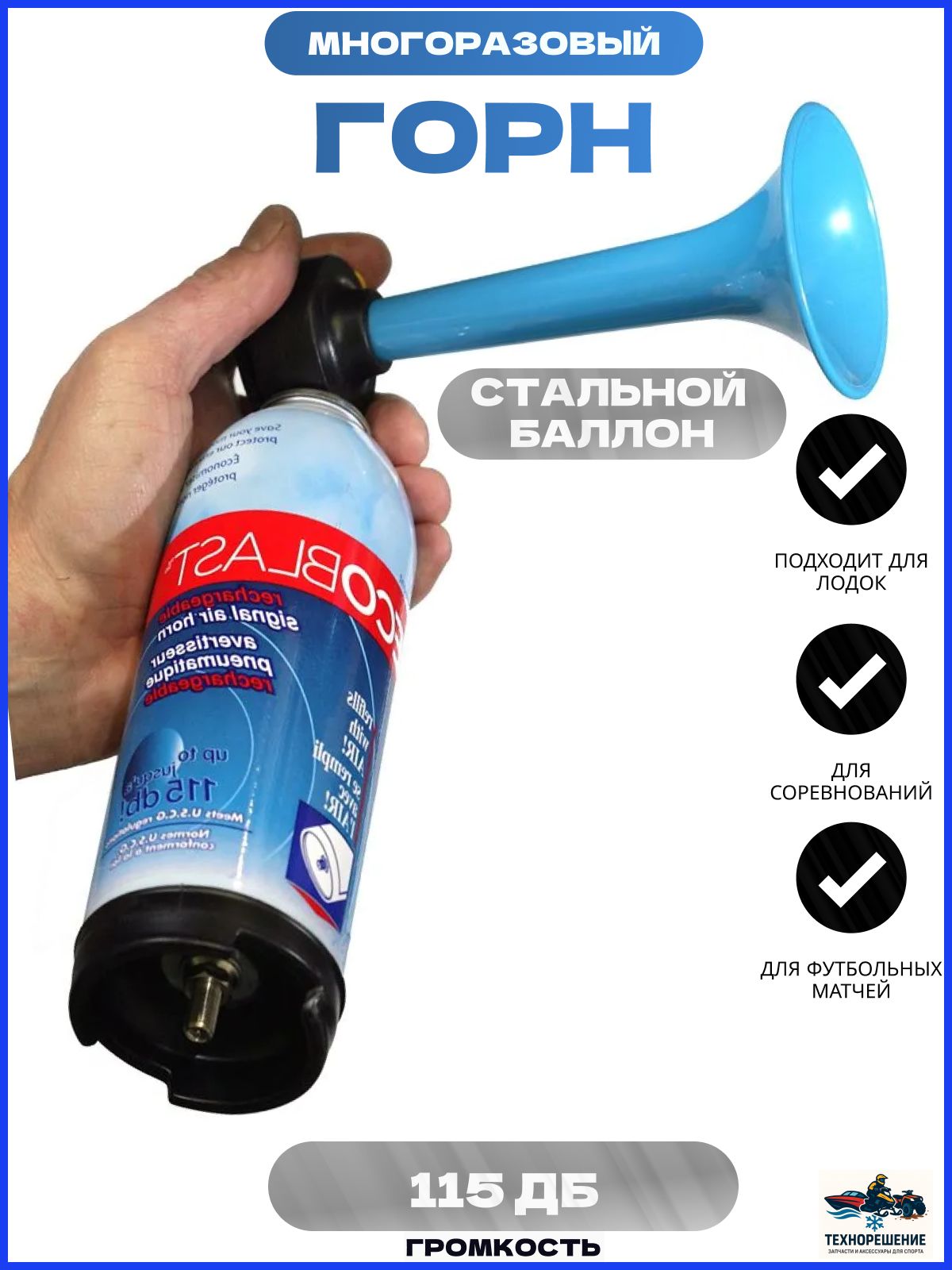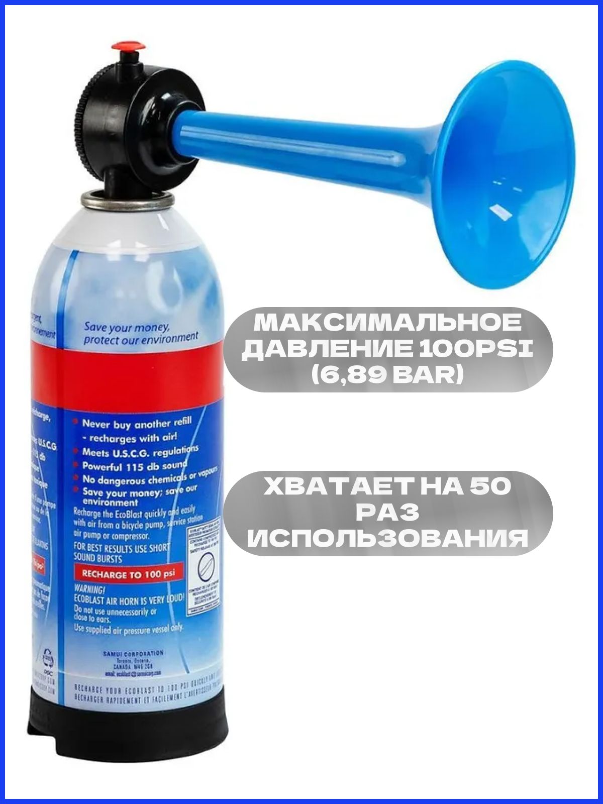 Пневматический перезаряжаемый горн — надёжное устройство для подачи громких звуковых сигналов в любых условиях. Этот горн воздушный оснащён резервуаром для сжатого воздуха и встроенным манометром для контроля давления. Работает около 2 минут от одной зарядки, после чего легко заправляется с помощью стандартного насоса (велосипедного, автомобильного, электрического) или воздуха высокого давления на АЗС.