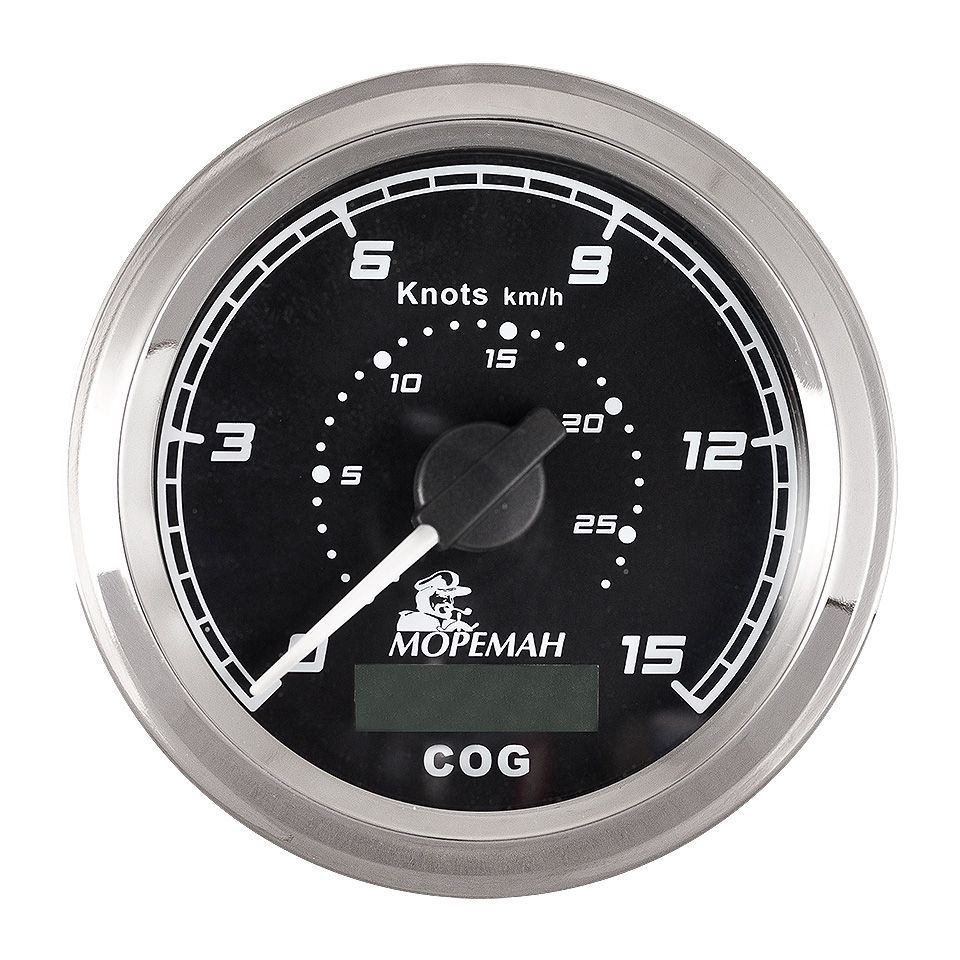 GPS спидометр, 15 узлов, черный циферблат (10252277). Отображают абсолютную скорость относительно земной поверхности. Двойная шкала узлы-км/ч. Стойкое к царапинам стекло. Стрелка с силиконовым демпфером, гасящим вибрацию и предотвращающим дрожание. Черный циферблат.