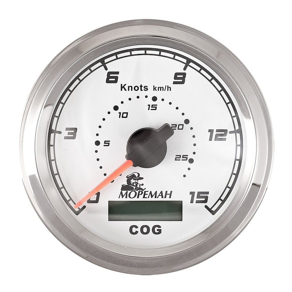 GPS спидометр, "Мореман" 15 узлов, белый циферблат (10252278 ). Белый циферблат.Отображают абсолютную скорость относительно земной поверхности. Двойная шкала узлы-км/ч. Стойкое к царапинам стекло. Стрелка с силиконовым демпфером, гасящим вибрацию и предотвращающим дрожание.