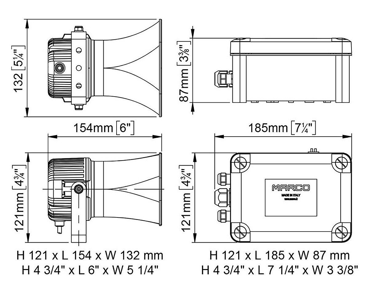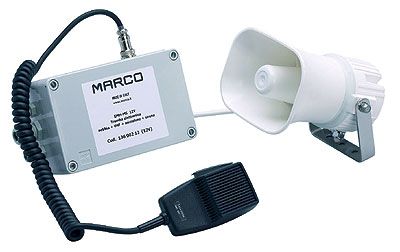 В комплект поставки входит громкоговоритель, блок управления и микрофон. Провода и кнопки для подачи питания, а также задействования функций туманного горна, сирены и аудиовхода приобретаются самостоятельно (любые низковольтные тумблеры и кнопки, подходящие по дизайну). Возможно также приобретение фирменного пульта управления. Напряжение питания: 12, 24 В. Громкость (на расстоянии 1 м): 112 Дб. Частота звука (режим горна): 800 Гц. Размеры: 154×121×132 мм. Производитель: "Marco", Италия.