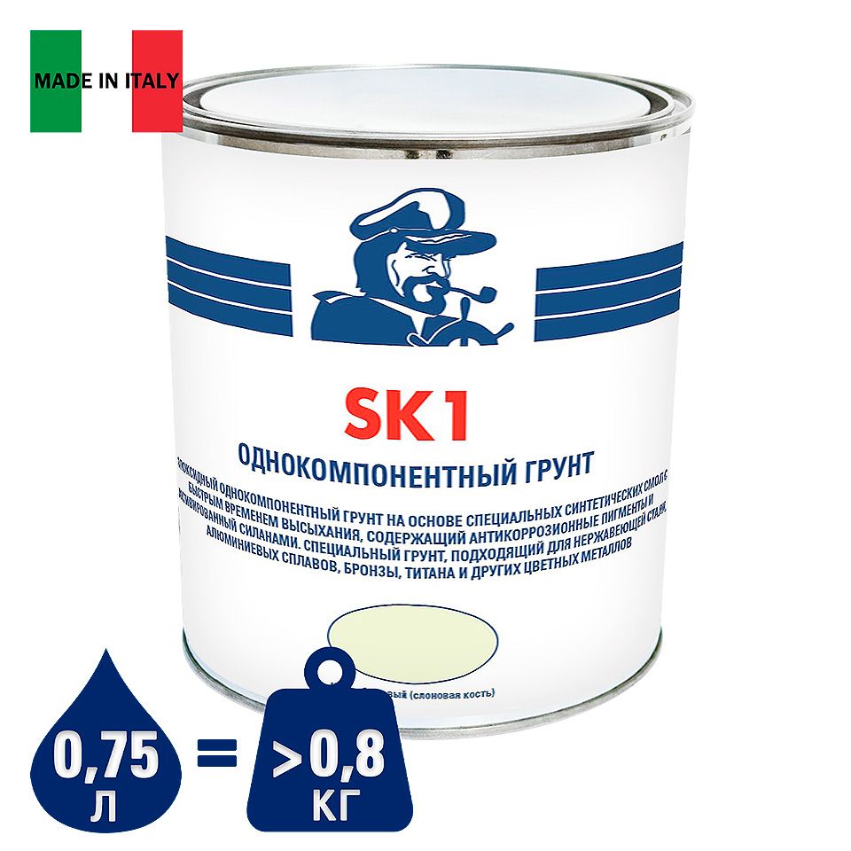 Эпоксидный однокомпонентный грунт SK1, на основе специальных синтетических смол с быстрым временем высыхания, содержащий антикоррозионные пигменты и активированный силанами. Специальный грунт, подходящий для нержавеющей стали, алюминиевых сплавов, бронзы, титана и других цветных металлов. Предназначен для непосредственного нанесения на различные типы гребных винтов из черных и цветных металлов, таких как нержавеющая сталь, латунь, алюминий и легкие сплавы, прошедших абразивную обработку. Также может быть нанесен на необработанные абразивными материалами поверхности корпуса судна, изготовленного, в частности, из алюминиевых сплавов. Образует стойкую и эластичную пленку, обладающую повышенными адгезионными свойствами, по которой наносятся необрастающие краски или дополнительные слои этого грунта, а также другие двухкомпонентные эпоксидные или полиуретановые грунты, либо эпоксидные шпаклевки.