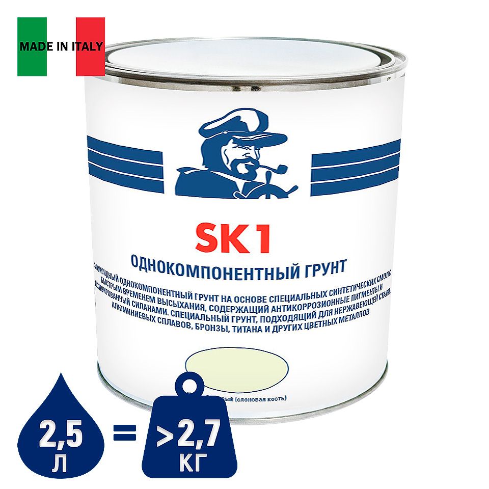 Эпоксидный однокомпонентный грунт SK1, на основе специальных синтетических смол с быстрым временем высыхания, содержащий антикоррозионные пигменты и активированный силанами. Специальный грунт, подходящий для нержавеющей стали, алюминиевых сплавов, бронзы, титана и других цветных металлов. Предназначен для непосредственного нанесения на различные типы гребных винтов из черных и цветных металлов, таких как нержавеющая сталь, латунь, алюминий и легкие сплавы, прошедших абразивную обработку. Также может быть нанесен на необработанные абразивными материалами поверхности корпуса судна, изготовленного, в частности, из алюминиевых сплавов. Образует стойкую и эластичную пленку, обладающую повышенными адгезионными свойствами, по которой наносятся необрастающие краски или дополнительные слои этого грунта, а также другие двухкомпонентные эпоксидные или полиуретановые грунты, либо эпоксидные шпаклевки.