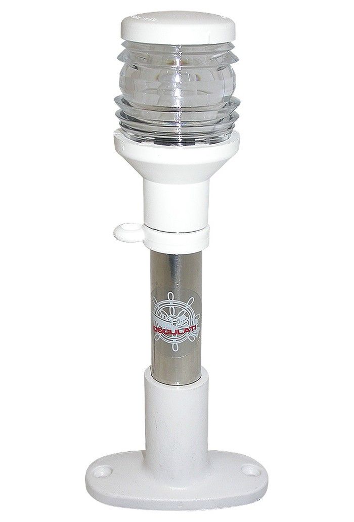 Клотиковый навигационный огонь 44 мм на стойке, 200 мм (10086138). Используется в качестве стояночного (якорного) огня. Правила допускают использование его в качестве универсального ходового огня на гребной лодке и парусной яхте длиной менее 7 метров (в этом случае, требуется еще и фонарь для освещения парусов, который включают при приближении другого судна). Линза Френеля способствует распределению светового потока в горизонтальной плоскости, что увеличивает дальность видимости огня при неизменной мощности лампы. Цвет корпуса - белый.