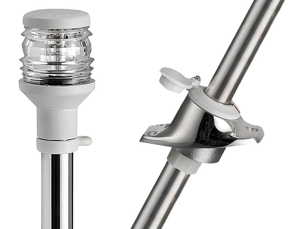 Клотиковый огонь на выдвижной стойке 600 мм, белый пластик (10235903). Белый навигационный огонь с дугой освещения 360 градусов на выдвижной стойке высотой 600 мм. Используется в качестве стояночного (якорного) огня. Правила допускают использование его в качестве универсального ходового огня на гребной лодке и парусной яхте длиной менее 7 метров (в этом случае, требуется еще и фонарь для освещения парусов, который включают при приближении другого судна). Линза Френеля способствует распределению светового потока в горизонтальной плоскости, что увеличивает дальность видимости огня при неизменной мощности лампы.Напряжение питания: 12 В. Номинальная мощность: 10 Вт. Материал корпуса: пластик (черный/белый), нержавеющая сталь.Производитель: "Osculati", Италия.