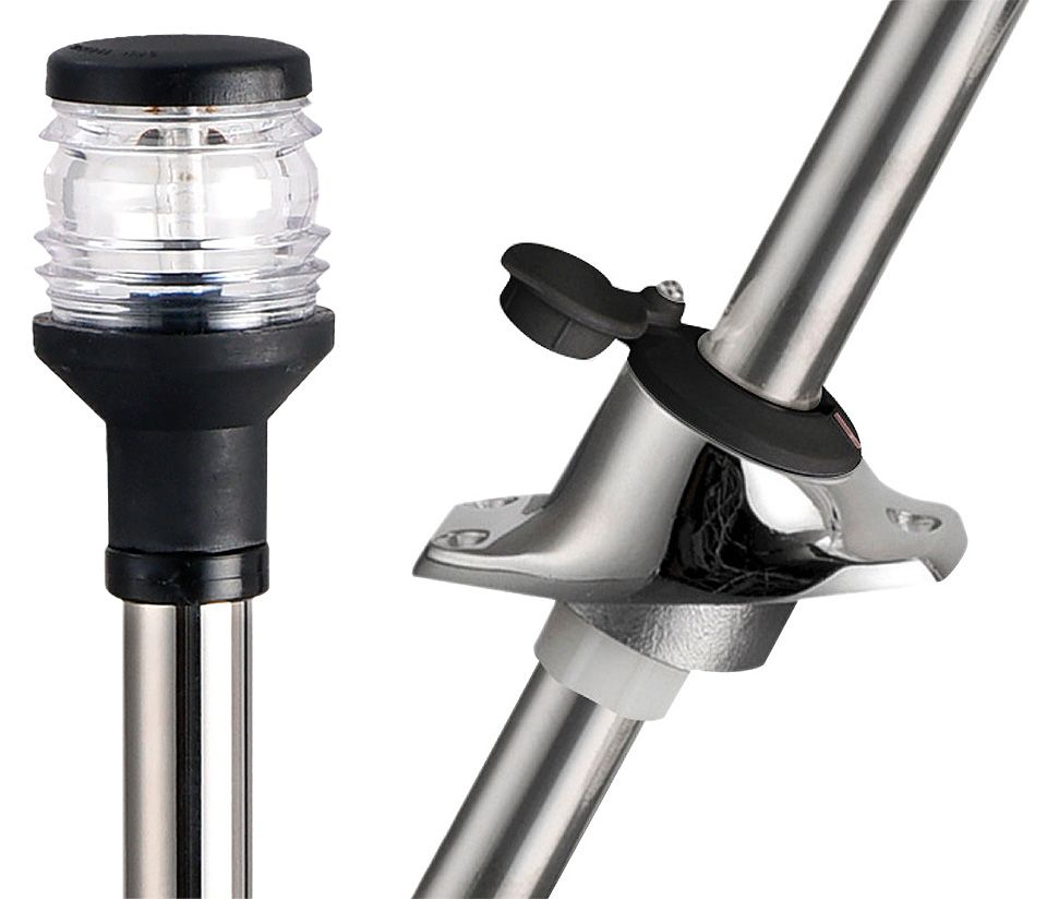 Клотиковый огонь на выдвижной стойке 600 мм, черный пластик (10015645). Белый навигационный огонь с дугой освещения 360 градусов на выдвижной стойке высотой 600 мм. Используется в качестве стояночного (якорного) огня. Правила допускают использование его в качестве универсального ходового огня на гребной лодке и парусной яхте длиной менее 7 метров (в этом случае, требуется еще и фонарь для освещения парусов, который включают при приближении другого судна). Линза Френеля способствует распределению светового потока в горизонтальной плоскости, что увеличивает дальность видимости огня при неизменной мощности лампы.Напряжение питания: 12 В. Номинальная мощность: 10 Вт. Материал корпуса: пластик (черный/белый), нержавеющая сталь.Производитель: "Osculati", Италия.