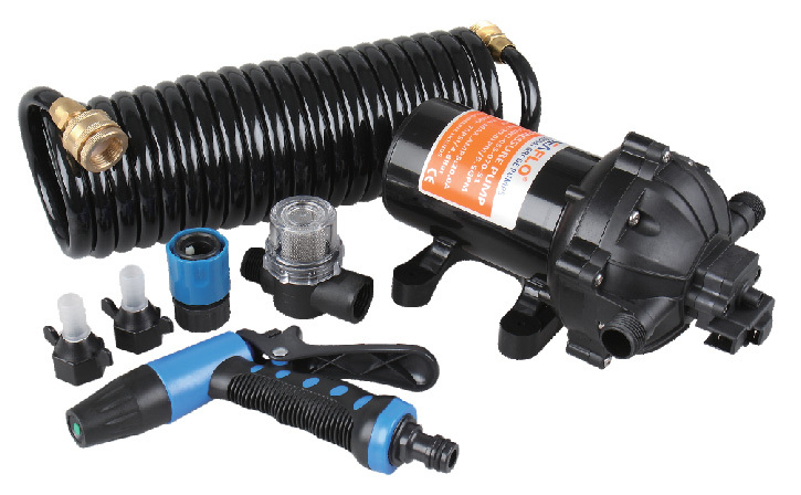 Комплект для мытья палубы, 18,9 л/мин, 12 В, шланг 6 м (10256507). Комплект, включающий автоматическую самовсасывающую помпу производительностью 18,9 или 11,6 л/мин, витой шланг (6 или 7,5 м), быстроразъемный соединительный штуцер, раздаточный пистолет с клапаном, фильтр.