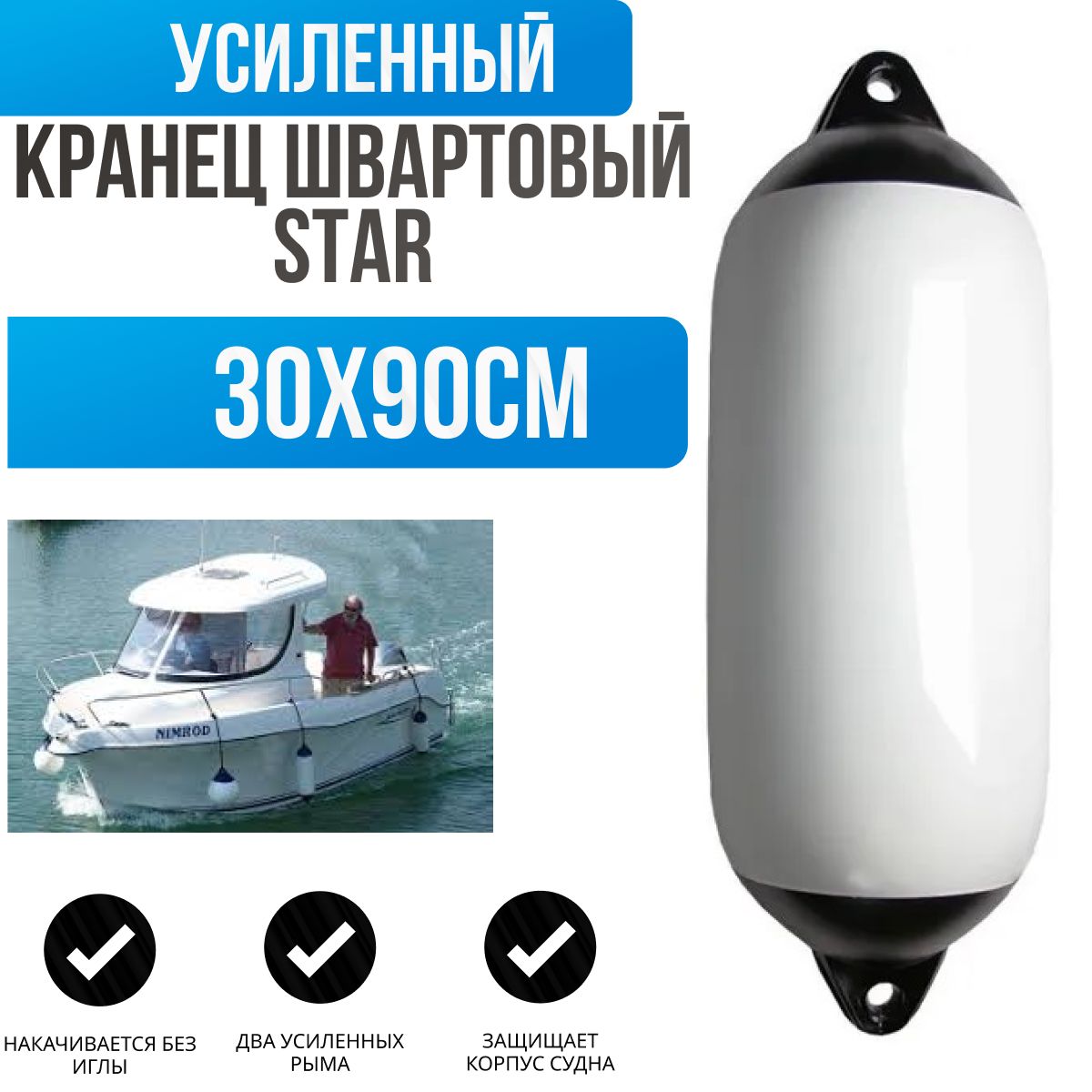 Надувной кранец из ПВХ белого цвета с двумя черными рымами, производства компании *Majoni* (Голландия), серия *Star*, идеально подходит для защиты вашего судна при швартовке. Изготовленный из высококачественного ПВХ-материала, он устойчив к воздействию морской воды, ультрафиолетовых лучей и механическим повреждениям, что гарантирует долгий срок службы. Размер 30x90 см делает его отличным выбором для средних и крупных судов. Два прочных черных рым-крепления обеспечивают легкость монтажа и надежную фиксацию. Этот кранец надежно защищает корпус судна от повреждений при столкновении, обеспечивая безопасность и комфорт при эксплуатации на воде.