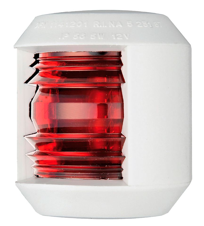 Красный бортовой навигационный огонь в белом корпусе. (10005086). Красный бортовой отличительный огонь с лампой накаливания. Устанавливается на левом борту судна. Обеспечивает освещение сектора с углом в основании 112,5 градусов. Линза Френеля способствует распределению светового потока в горизонтальной плоскости, что увеличивает дальность видимости огня при неизменной мощности лампы. Напряжение питания: 12 В. Номинальная мощность: 10 Вт. Материал корпуса: пластик. Цвет корпуса: белый или черный. Размеры: 63х49х40 мм. Производитель: "Osculati", Италия.