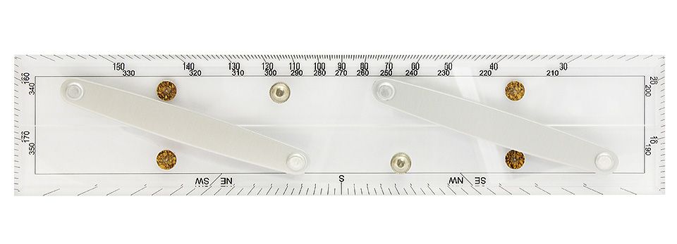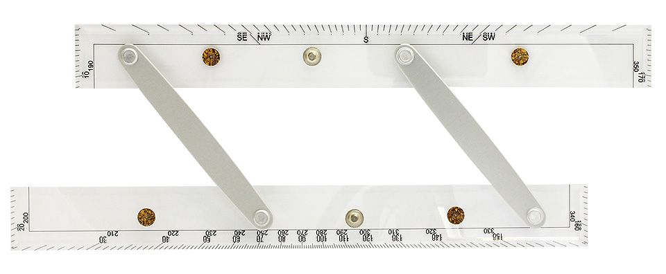 Линейка с гониометром (10005746). Пантографная линейка (две параллельных линейки, соединенных рычагами) с гониометром (прибор для измерения углов) из прозрачного пластика. Позволяет передвигать линейки друг относительно друга поперек карты без изменения угла между ними. Применяется в штурманских работах. Производитель: Micron, Италия.
