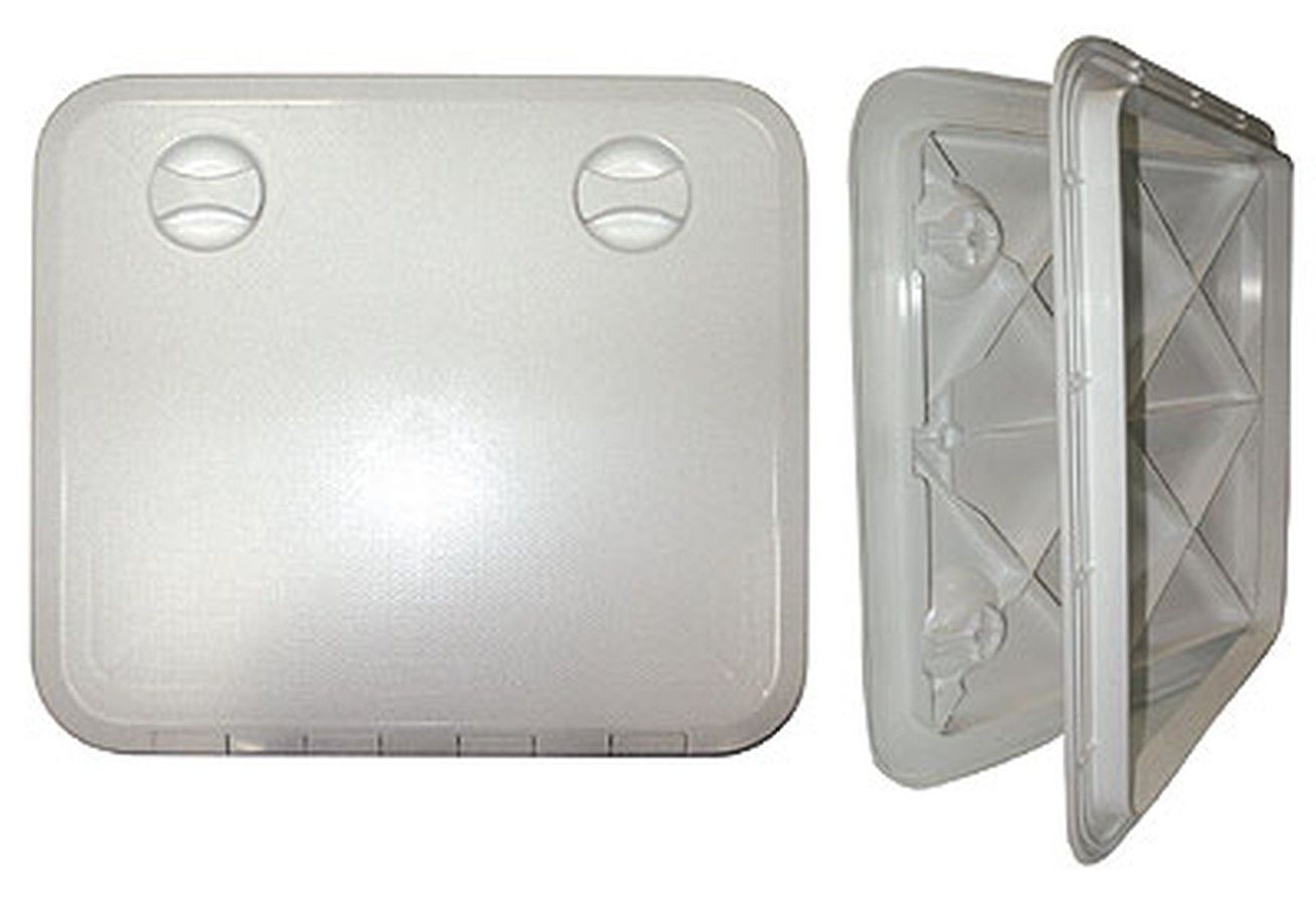 Люк пластиковый 380х380 мм, с замком (10241855). Люки из прочного белого пластика. Используются для организации доступа в рундуки, полости борта и т.п. объемы. Легко устанавливаются с помощью винтов (саморезов) и герметика. Поставляются в двух вариантах — с задвижками и замком или только с задвижками.Размеры габаритные: 280х375, 380х380, 460х510, 360х600 мм.Производитель: "Ceredi", Италия