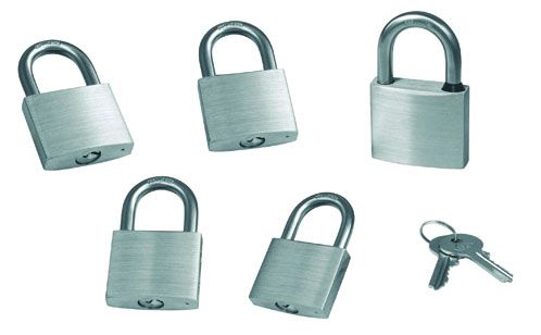Набор навесных замков (10248002). Пять одинаковых замков с одним комплектом ключей. Удобен для запирания дверей, рундуков, люков на одной лодке - избавляет от необходимости иметь и хранить связку ключей от разных замков. Изготовлены из нержавеющей стали и бронзы.