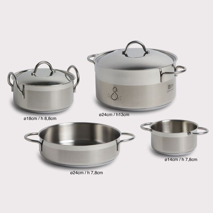 Набор посуды из нержавеющей стали, 7 предметов (10254579). Уникальный набор посуды, занимающий минимальный объем на камбузе! 4 кастрюли и 3 крышки. Все 7 предметов помещаются для хранения внутрь самой большой кастрюли и надежно запираются металлическими защелками. Посуда изготовлена из качественной нержавеющей стали.Производитель: "Marine Business", Испания.