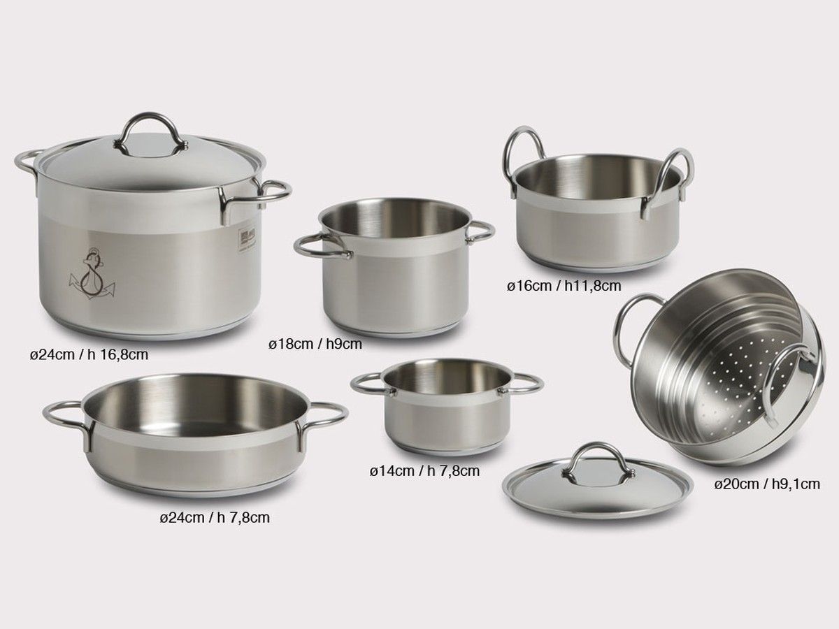 Набор посуды из нержавеющей стали, 8 предметов (10254578). Уникальный набор посуды, занимающий минимальный объем на камбузе! Все 8 предметов помещаются для хранения внутрь самой большой кастрюли и надежно запираются металлическими защелками. Посуда изготовлена из качественной нержавеющей стали.