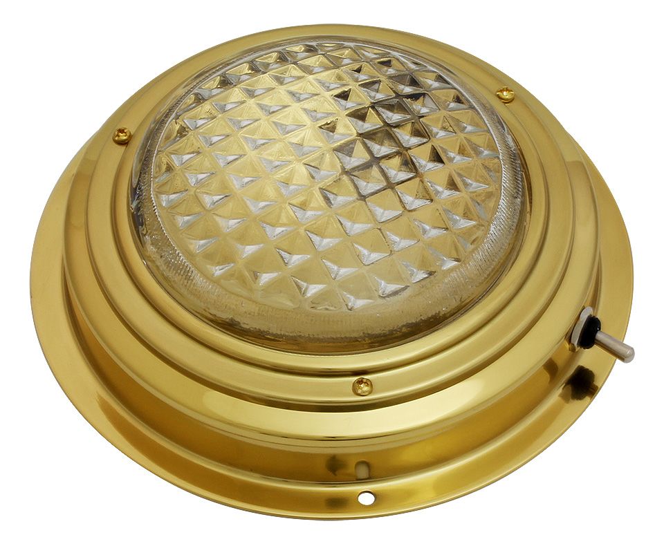 Накладной плафон освещения в латунном корпусе, 3 дюйма (10017228). Классический судовой светильник с лампой накаливания. Компактный и легкий в установке. Снабжен собственным выключателем. Выполняется в трех вариантах оформления – в корпусе из полированной нержавеющей стали, в латунном корпусе и в корпусе из полированного тика с золотистым латунным ободком.