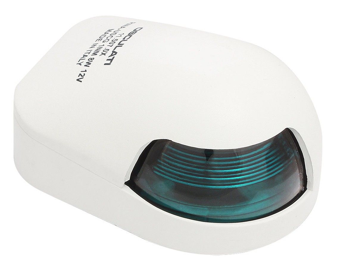 Навигационный огонь, зеленый (10244742). Зеленый отличительный огонь с лампой накаливания. Устанавливается на правом борту судна. Обеспечивает освещение сектора с углом в основании 112,5 градусов. Линза Френеля способствует распределению светового потока в горизонтальной плоскости, что увеличивает дальность видимости огня при неизменной мощности лампы. Рекомендуется для судов длиной до 12 м. Напряжение питания: 12 В. Номинальная мощность: 8 Вт. Корпус: белый пластик. Размеры: 80х58х38 мм. Производитель: "Osculati", Италия.