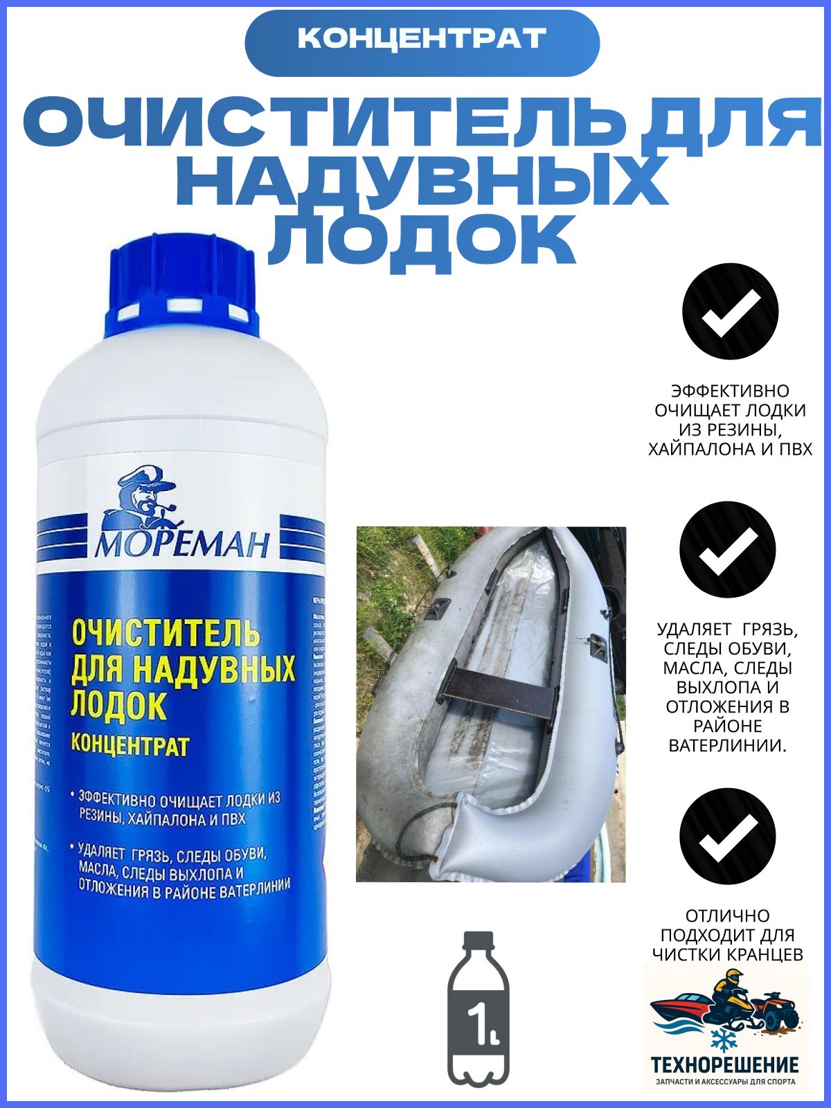 Очиститель для надувных лодок "Мореман" ( 1 л ) (10269646). Очиститель для надувных лодок МОРЕМАН, концентрат. • Эффективно очищает лодки из резины, хайпалона и ПВХ.• Удаляет грязь,