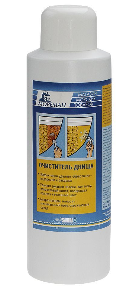 Очиститель днища, 1000 мл (10258214). Эффективно удаляет обрастания, водоросли и ракушки, с днища судна. Также удаляет ржавые потеки, желтизну, известковый налет, возвращая корпусу начальный цвет. Биоразлагаем, наносит минимальный вред окружающей среде. Внимание! Данный очиститель не рекомендован для алюминиевых лодок, а также дейдвудов подвесных моторов и угловых колонок, для их очистки следует применять специльный очиститель для алюминия (№ 10258230).