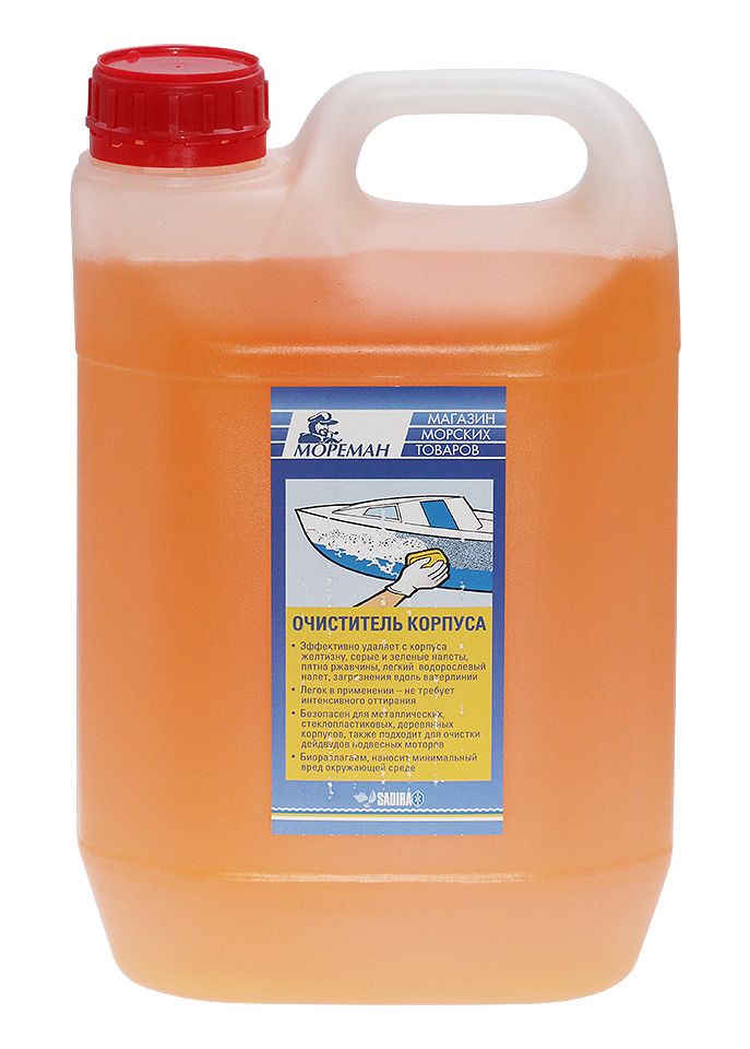 Очиститель корпуса, 5000 мл (10258213). Эффективно удаляет с корпуса желтизну, серые и зеленые налеты, пятна ржавчины, легкий водорослевый налет, загрязнения вдоль ватерлинии. Легок в применении - не требует интенсивного оттирания. Безопасен для металлических, стеклопластиковых, деревянных корпусов (окрашенных), также подходит для очистки дейдвудов подвесных моторов и угловых колонок (с ненарушенным лакокрасочным покрытием). Внимание! Данный очиститель не рекомендован для алюминиевых лодок, а также дейдвудов подвесных моторов и угловых колонок с нарушенным лакокрасочным покрытием, для их очистки следует применять специльный очиститель для алюминия (№ 10258230).