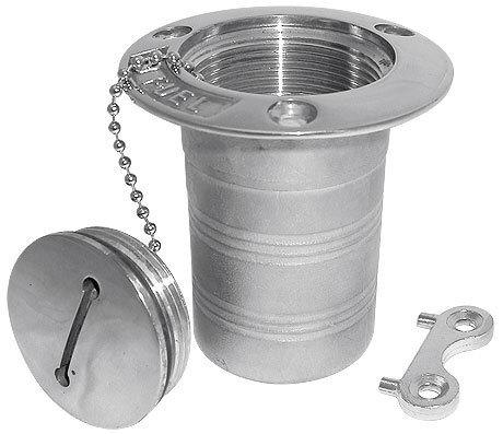 Палубная горловина, "Fuel", 50 мм (10246772). Палубные горловины из нержавеющей стали (AISI 316) для топлива с надписью "Fuel" на фланцах. Снабжены резьбовыми пробками с резиновыми уплотнениями и вертлюжными цепочками. Ключ для отворачивания пробки входит в комплект. Верхняя часть горловины (фланец и пробка) отполированы.