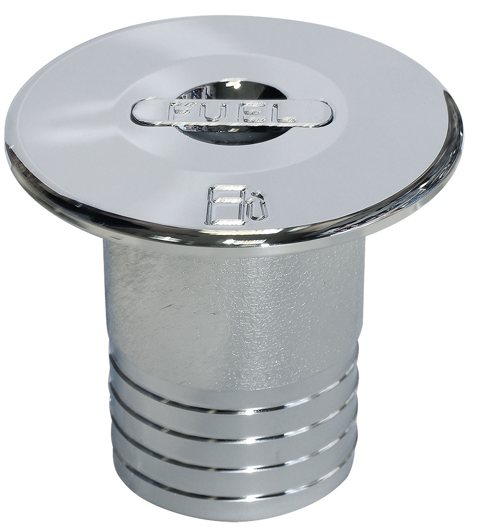 Палубная заливная горловина из хромированной латуни. Надпись "Fuel" (топливо) на крышке. Патрубки под шланг с внутренним диаметром 38 или 50 мм.