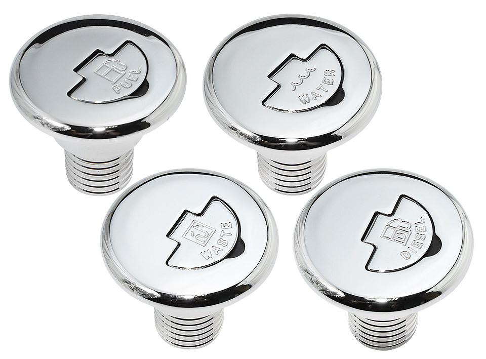 Заливные палубные горловины с поднимающимися ручками (в сложенном состоянии утапливаются заподлицо с верхней плоскостью крышек горловин). Изготовлены из высококачественной хромированной латуни. Высочайшее качество (100% сделано в Италии!). Доступны под шланги диаметром 38 или 50 мм. Варианты с надписями Fuel (топливо), Diesel (дизельное топливо), Water (вода), Waste (сточные воды).