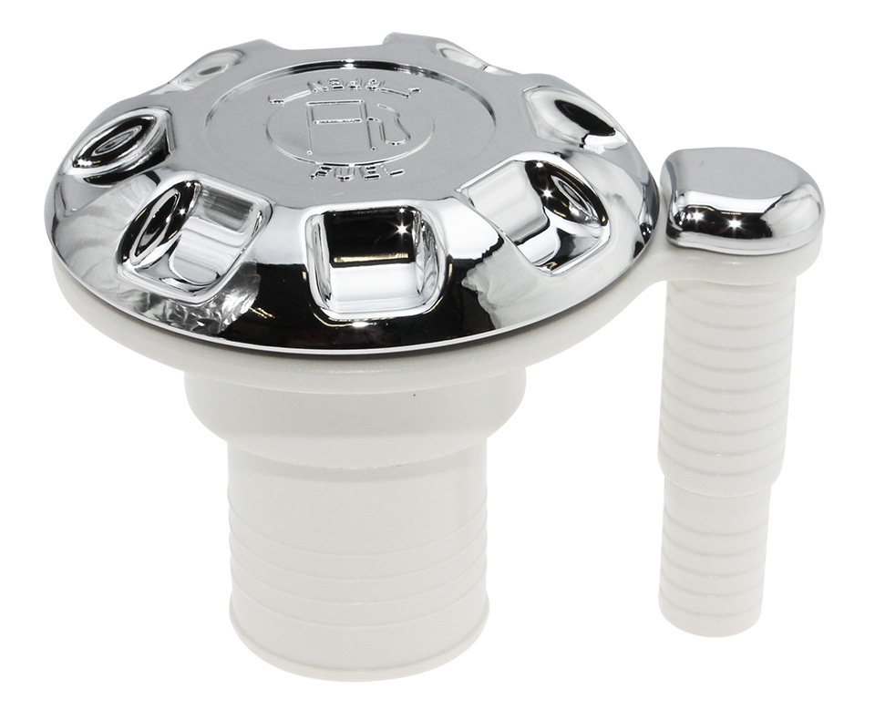 Палубная горловина, объединенная с вентиляционным патрубком. Надпись "fuel" (топливо) на крышке. Патрубок под топливный шланг с внутренним диаметром 38 мм. Вентиляционный патрубок под шланг с внутренним диаметром 19-20 мм. Два варианта: белая и хромированная.