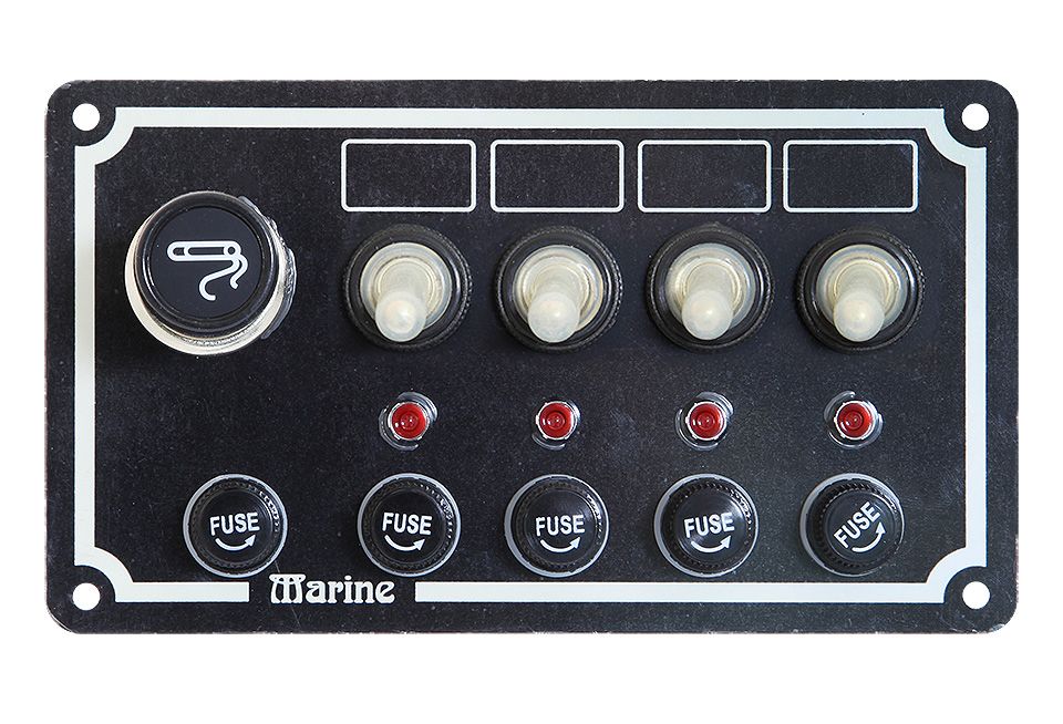 Панель выключателей, 4 тумблера, прикуриватель, серебристая (10247862). Серебристое алюминиевое основание. 4 тумблера, защищенных силиконовыми колпачками. Светодиодные индикаторы включения. Гнезда под плавкие предохранители. Прикуриватель.