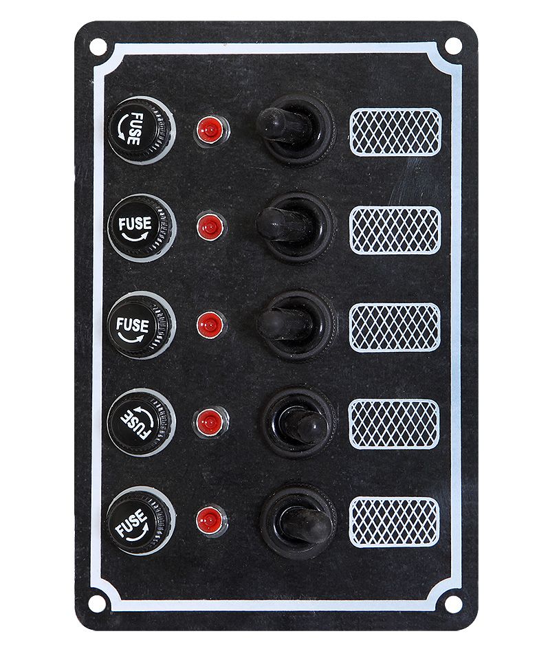 Панель выключателей, 5 тумблеров (10247859). Новинка! Черное алюминиевое основание. 5 или 6 тумблеров, защищенных резиновыми колпачками. Светодиодные индикаторы включения. Гнезда под плавкие предохранители.