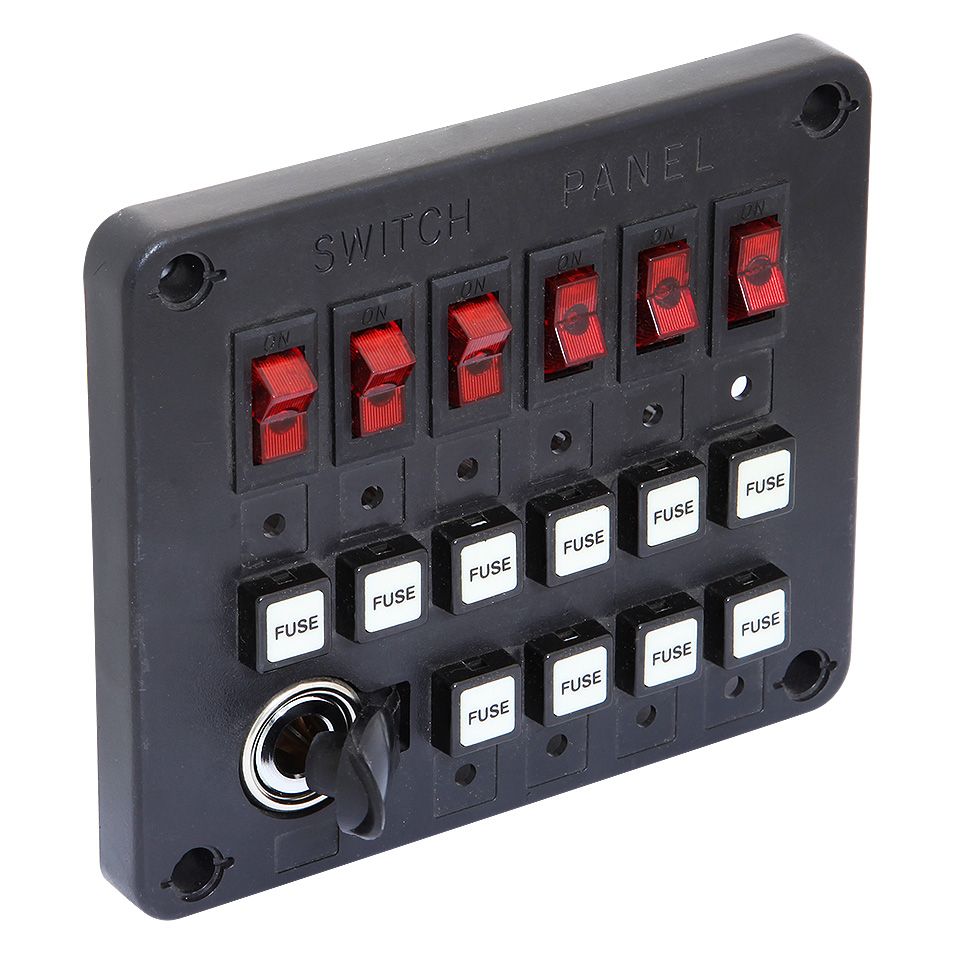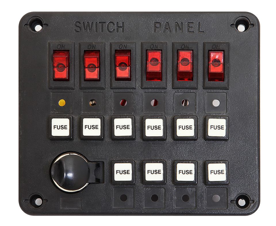 Панель выключателей c 6 клавишами, 10 предохранителями и гнездом под малый штекер (10006053). Панель из черного пластика с (толщина 25 мм за счет фланца) четырьмя крепежными отверстиями по углам. 6 клавиш с подсветкой и плавкими предохранителями. 4 дополнительных предохранителя. В левом нижнем углу имеется гнездо под малый автомобильный штекер (с пластиковой крышкой).